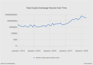 Skôr ako sa dostaneme k porovnaniu s internetom, pozrime sa aj na celkový objem obchodovania so všetkými kryptomenami od roku 2014 do roku 2018. Hodnoty boli spriemerované za mesiac, pre lepší prehľad o celkovej trendovej línii.