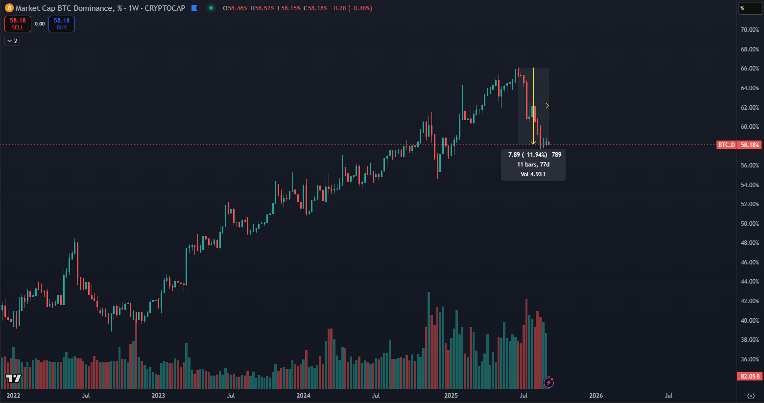 Dominancia Bitcoinu zaznamenáva najväčší pokles od roku 2022. Za posledné dva a pol mesiaca klesla o 12 %, z lokálneho maxima 66 % na súčasných 58 %. Tento trend naznačuje, že investori presúvajú kapitál do altcoinov a hľadajú vyššie zisky mimo hlavnej kryptomeny, čím sa diverzifikuje trhové portfólio a zvyšuje aktivita na alternatívnych blockchainových projektoch.