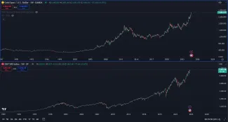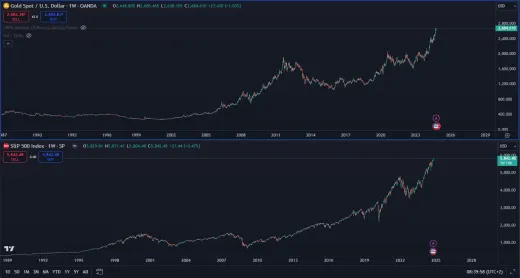 Nie je úplne jednoduché porovnať cenovú výkonnosť na základe fixného časového intervalu, pretože oba trhy zaznamenávajú rôzne vrcholy a dná. Napriek tomu sa pozrime na niekoľko čísel. Za posledné 3 roky stúpla cena zlata o 55 %, zatiaľ čo hodnota amerického akciového indexu S&P500 stúpla len o 35 %. Je potrebné si uvedomiť, že v tomto raste je započítaný aj exponenciálny vzostup technologických gigantov poháňaných umelou inteligenciou.