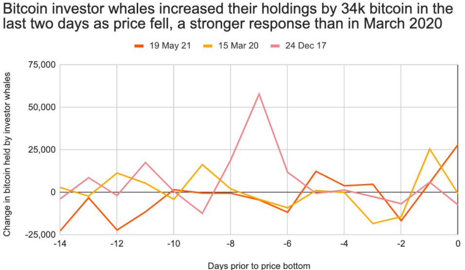 Ako je zrejmé z grafu, veľryby po roku 2017 kúpili medzi 18. a 19. májom 34 000 BTC po tom, čo počas dvoch týždňov pred tým znížili svoje držby o 51 000 BTC. To preukázalo silnejšiu odozvu ako investori v marci 2020.