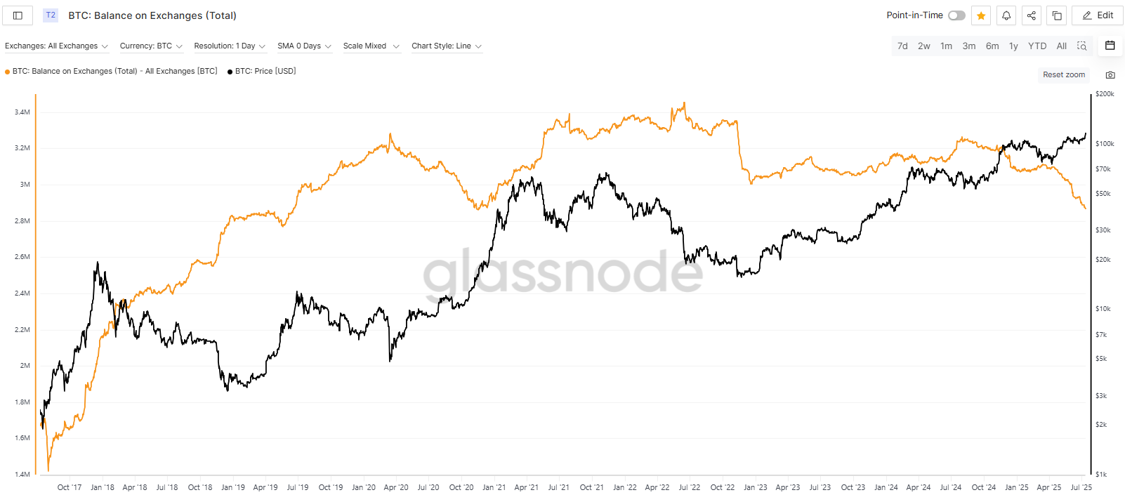 Aj keď sme svedkami poklesu držieb na burzách za posledné roky, podľa údajov Glassnode sú tieto mince naďalej smerodajné pri určovaní trhovej ceny Bitcoinu. Aktuálne sa na burzách nachádza približne 2,89 milióna mincí, ktoré zohrávajú kľúčovú úlohu v cenovej dynamike.