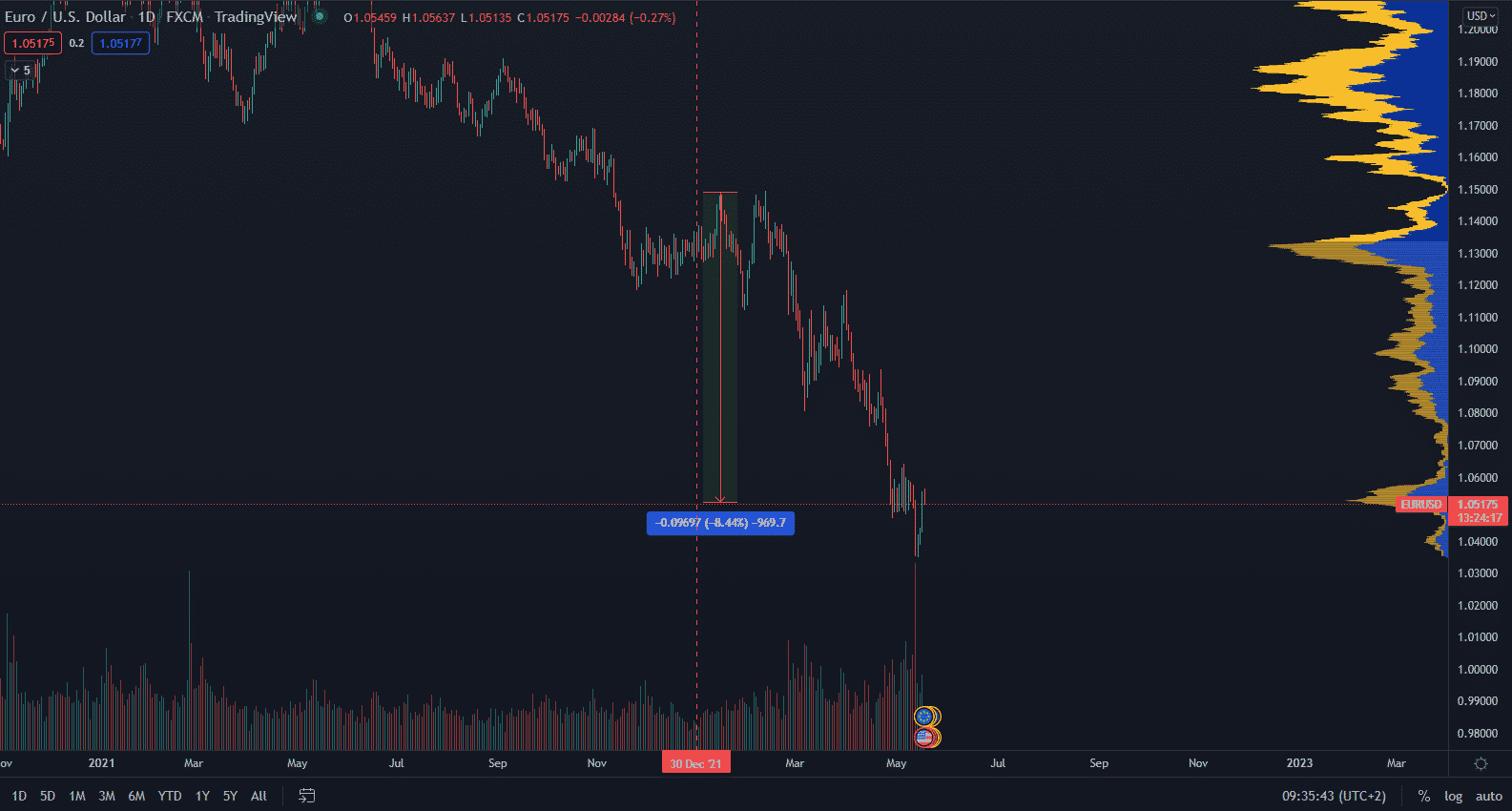 Pred chvíľou sme si ukázali, aké boli prepady rôznych aktív za posledné obdobie voči doláru. Preto si taktiež porovnajme prepad eura voči doláru. Porovnajme si rovnakú periódu od prelomu rokov 2021 a 2022. Ako vidíme, euro stratilo voči doláru v roku 2022 „iba” 8,5 %.