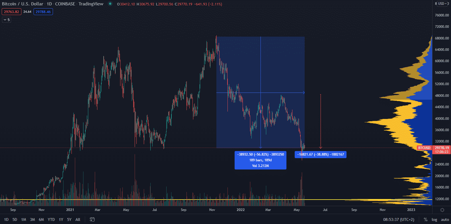 Bitcoin od svojho ATH z novembra 2021 klesol zhruba o 57 %. V rámci tohto prepadu je započítaných takmer 40 % prepadu od rusko-ukrajinského konfliktu. Zatiaľ nevidíme ani náznak býčej sily obrátiť trend.