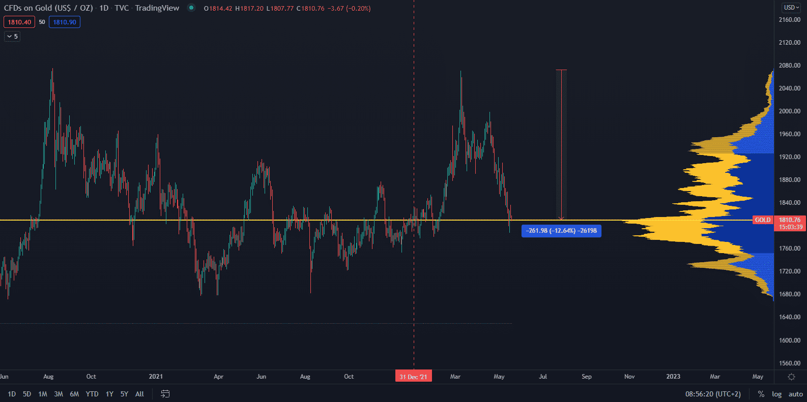 Zlato sa momentálne obchoduje za takmer rovnakú cenu ako na prelome rokov 2021 a 2022. Teda v časoch, keď Bitcoin a SPX dosahovali svoje lokálne maximá. SPX kleslo o 15 %, Bitcoin o 57 % a zlato sa obchoduje za rovnaké úrovne. Ako vidíme, nie všetky trhy reagujú na aktuálny stav rovnako.