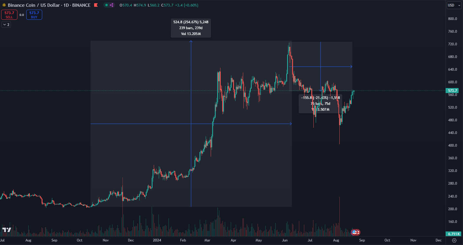 Ďalším poznatkom je sledovanie korekcie. V čase písania sa BNB od maxima obchoduje o 21 % nižšie. Len pre porovnanie, Bitcoin od októbra stúpol o 181 % po maximum a následne sa v súčasnosti obchoduje o 17 % nižšie. BNB má teda dokonca lepšiu výkonnosť ako Bitcoin, čo je jeden z kľúčových faktorov pri výbere kryptomeny.