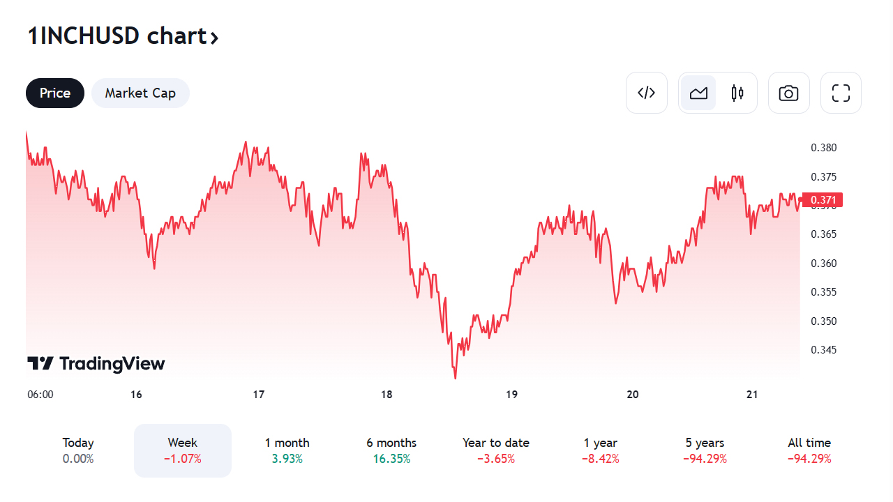 1inch Network zaznamenal v roku 2021 výrazný nárast a dosiahol historické maximum 7,87 dolárov. Následne však čelil klesajúcemu trendu, pričom v júni 2022 zaznamenal výrazný prepad na 0,5178 dolára.