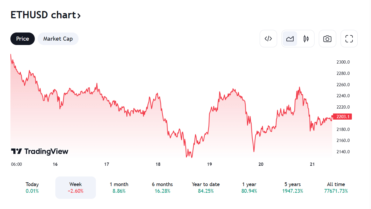 Cena vykazuje známky vzostupnej trajektórie. V súčasnosti sa nachádza na úrovni približne 2 200 dolárov a Ethereum opätovne testuje úroveň 2 100 dolárov, čo naznačuje potenciálny rast. Obchodníci sledujú úroveň 2 500 dolárov ako krátkodobý cieľ s ambíciou posunúť ju k hranici 2 700 dolárov.