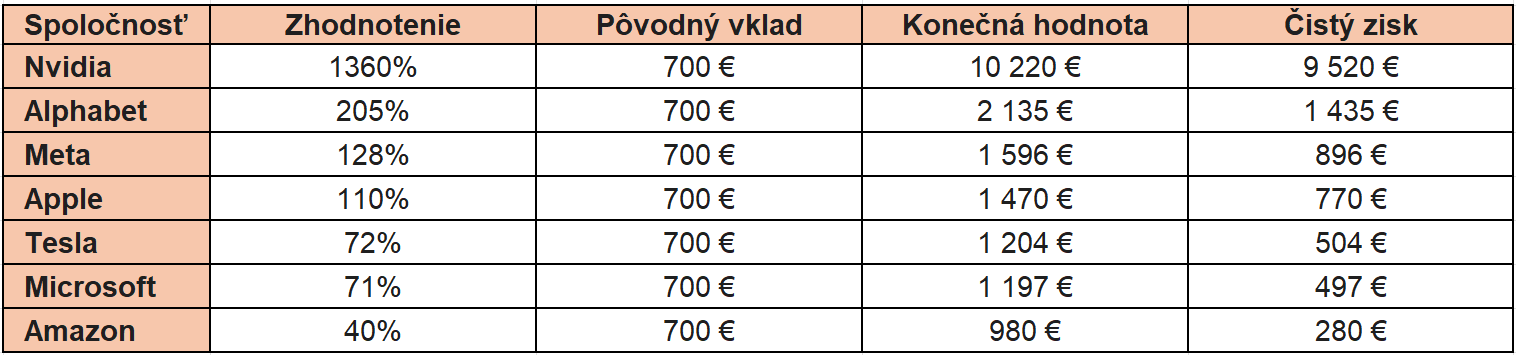 - Investícia do skupiny Magnificent 7 premenila pôvodný vklad 4 900 eur na sumu prevyšujúcu celkovú hodnotu 18 800 eur za 5 rokov.