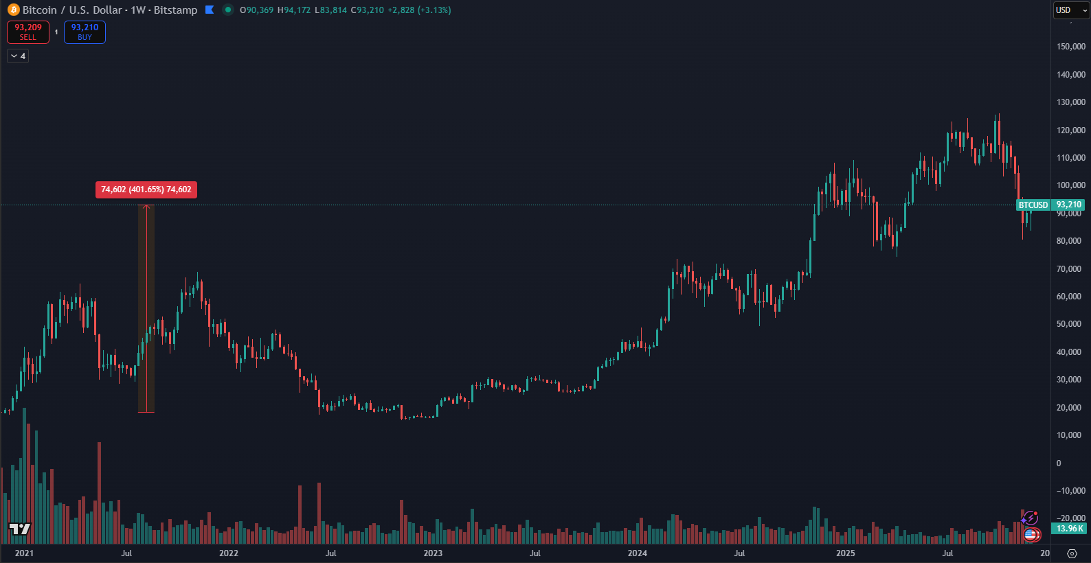 Bitcoin sa za posledných 5 rokov stal symbolom potenciálne vysokých výnosov pre investorov. Podľa údajov TradingView, ak ste pred 5 rokmi investovali 1 000 €, dnes by táto investícia predstavovala hodnotu približne 5 000 €, čo znamená zisk 400 %. Takýto nárast potvrdzuje, že dlhodobé držanie Bitcoinu môže byť výhodnejšie než snaha o rýchle obchodovanie na dennej báze.