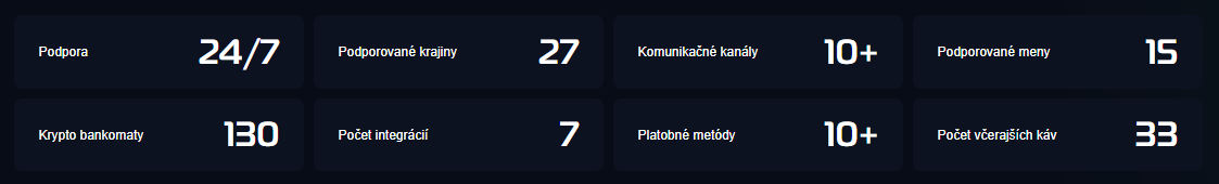 KvaPay v číslach hovorí za seba. Zákaznícka podpora funguje 24/7, platforma pokrýva 27 krajín a komunikuje cez viac ako 10 kanálov. Podporuje 15 mien, čo z nej robí skutočne medzinárodné riešenie. Infraštruktúra je rovnako pôsobivá – 130 krypto bankomatov, 7 integrácií s externými systémami a viac ako 10 platobných metód zaručuje flexibilitu pre každého používateľa.