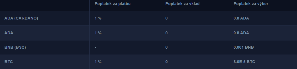 Poplatky KvaPay sa líšia v závislosti od typu služby, ktorú používateľ využíva. Pri použití kryptomenovej peňaženky KvaPay nie sú žiadne poplatky za správu účtu ani transakcie medzi používateľmi. Avšak pre výbery a vklady sú poplatky individuálne podľa meny. Detailný prehľad nájdete tu. Zhrnieme si však tie najdôležitejšie: