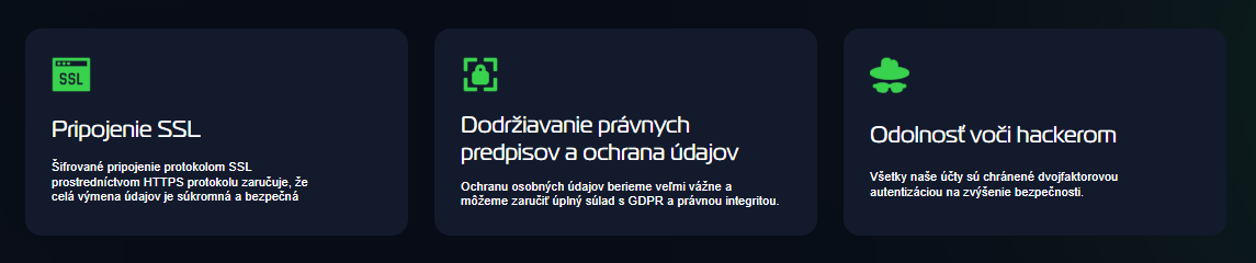 - Pripojenie SSL zabezpečuje šifrovanú komunikáciu prostredníctvom HTTPS protokolu. Každá výmena údajov medzi používateľom a platformou je súkromná a chránená pred odpočúvaním či zneužitím tretími stranami.