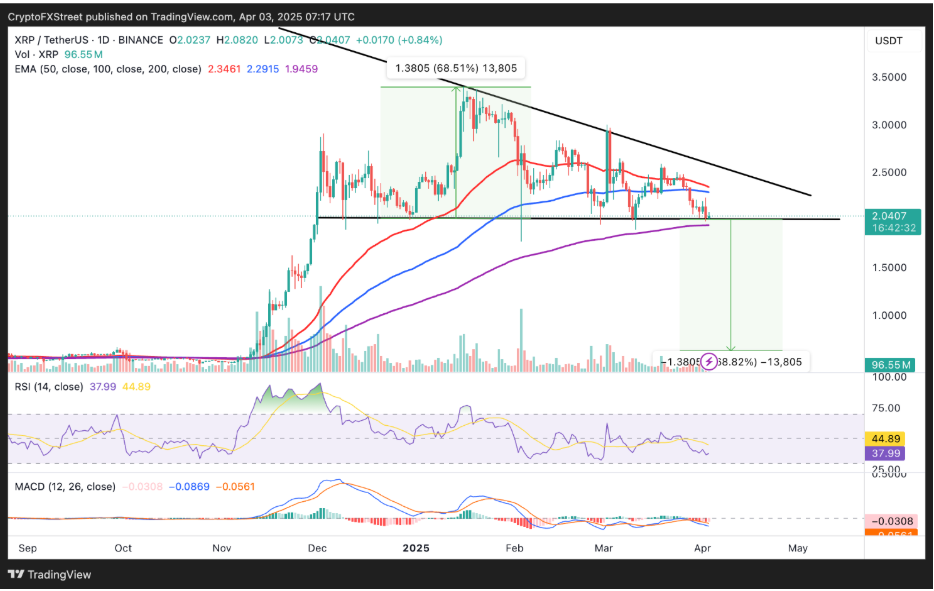 Pokles hodnoty XRP sa podľa analytikov zhorší, ak trh nedokáže ubrániť podpornú úroveň 2 dolárov. Zostupný trendový vzor na dennom grafe naznačuje, že XRP môže klesnúť o 68 % až na úroveň 0,62 dolára, ak trhové napätie nedosiahne extrémne výšky.
