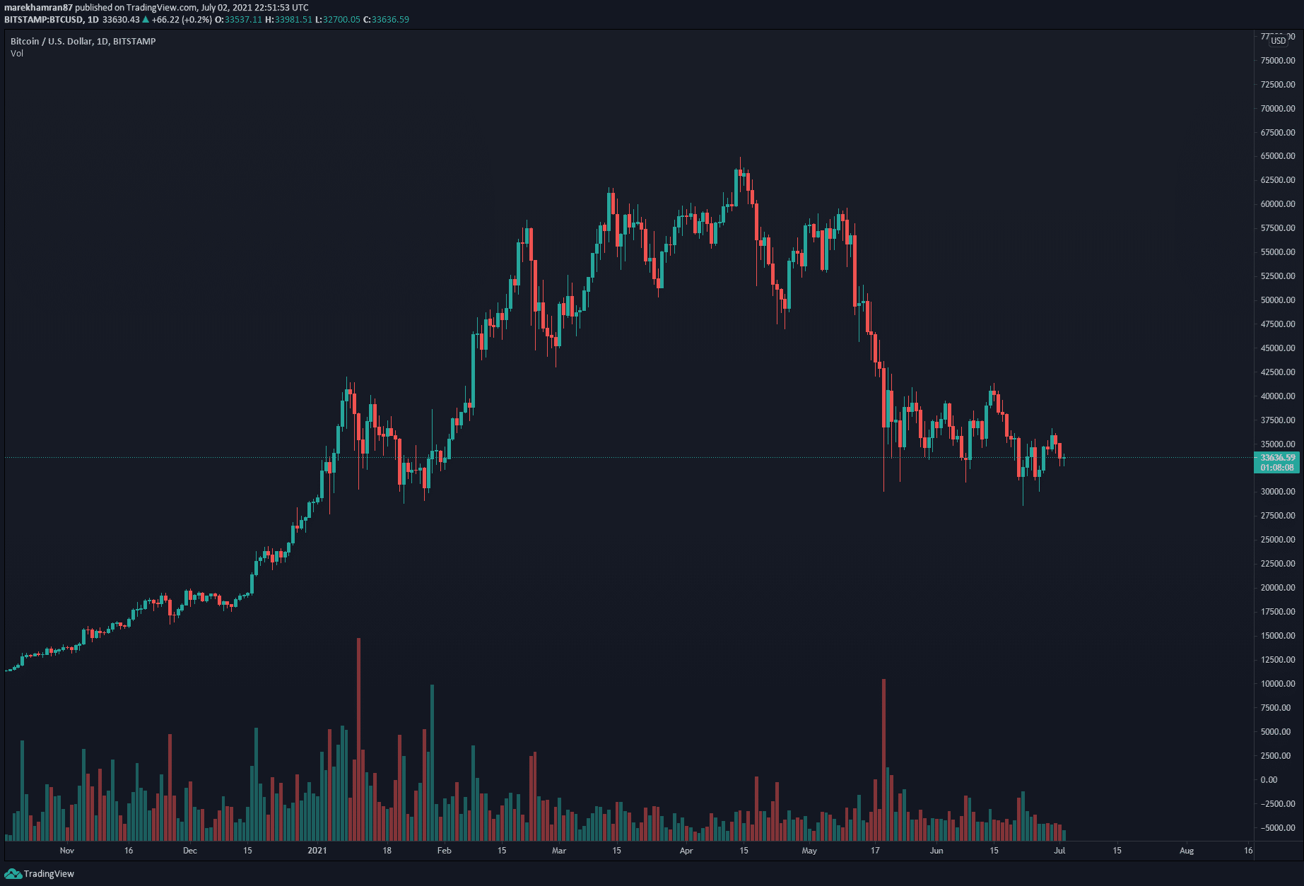 V čase písania článku sa cena BTC/USD pohybovala na úrovni 33 622 USD.