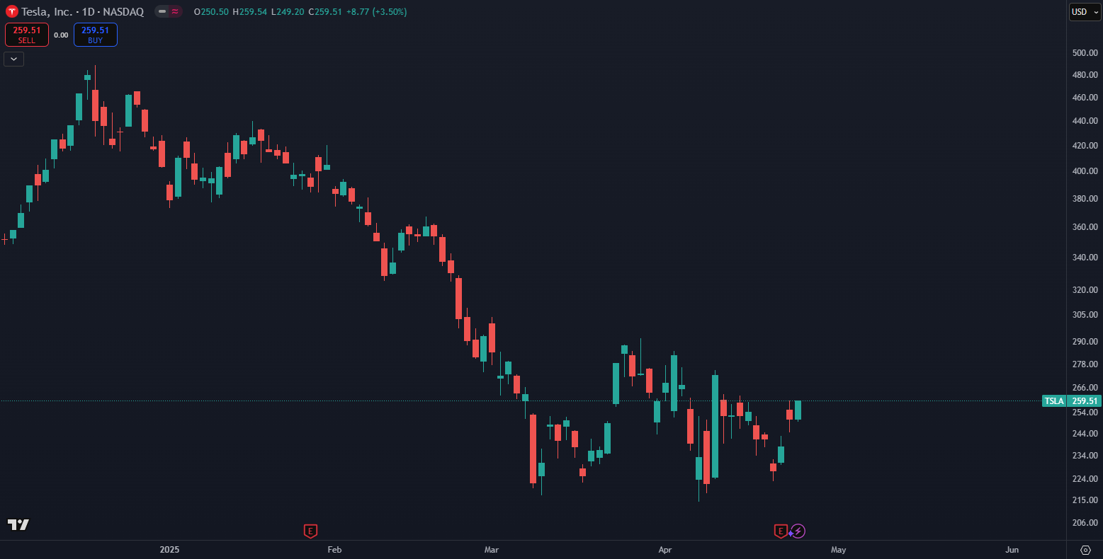 Tesla zaznamenala prudký pád akcií. Zdroj: tradingview.com