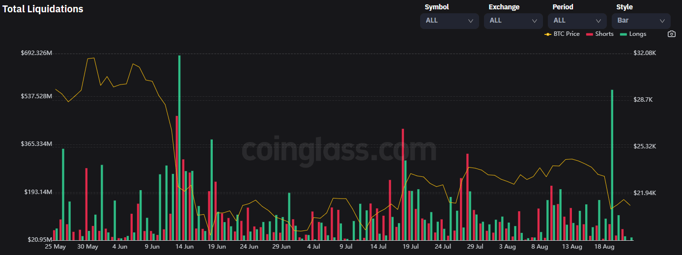 Likvidácia longových pozícií dosiahla 562 miliónov dolárov podľa údajov spoločnosti Coinglass. Tieto straty sú najvyššie od 13. júna, čím zlomili dvojmesačný rekord. Vtedy likvidácie dosiahli úroveň až 685 miliónov dolárov.