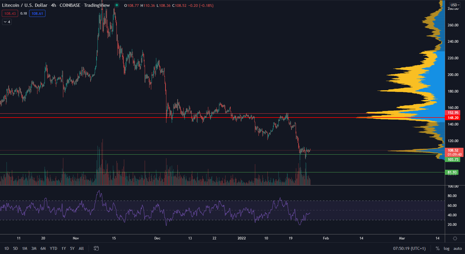 Litecoin sa momentálne nachádza na supportnej línii zhruba 105 $. Dokázal dokonca vytvoriť dve rastúce krátkodobé minimá a navýšiť objemy, čo značí o oživení ochoty obchodovať kryptomenu. Napriek tomu stále nevidíme poriadny odraz ceny nahor, ktorá je zatiaľ vzdialená od reverzie trendu.