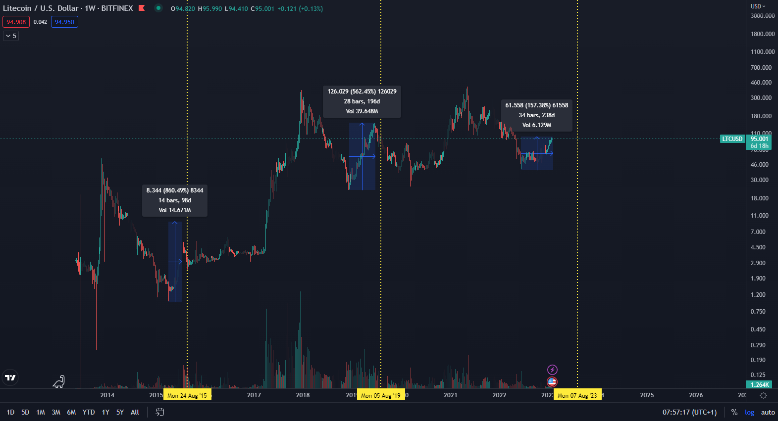 Podľa údajov z Litecoinhalving je ďalší halving očakávaný 3. augusta 2023, čo je približne o 6 mesiacov. Na grafe nižšie môžeme vidieť, že cena LTC sa pred poslednými halvingmi (žlté vertikálne čiary) vždy zhodnotila a dosiahla vrchol tesne pred ich uskutočnením. Počas posledného bullrunu rast predstavoval 562 % a predtým 860 %.