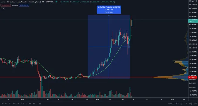 LUNA je blockchainový protokol zameraný na vybudovanie globálneho platobného systému poháňaného stablecoinom UST. Nedávno sa dostal na nové historické maximum na úrovni 46 dolárov. Údaje z TradingView ukazujú, že od 20. júla sa cena LUNA vyšplhala o 750 % vyššie na rekordné maximum 46 dolárov.