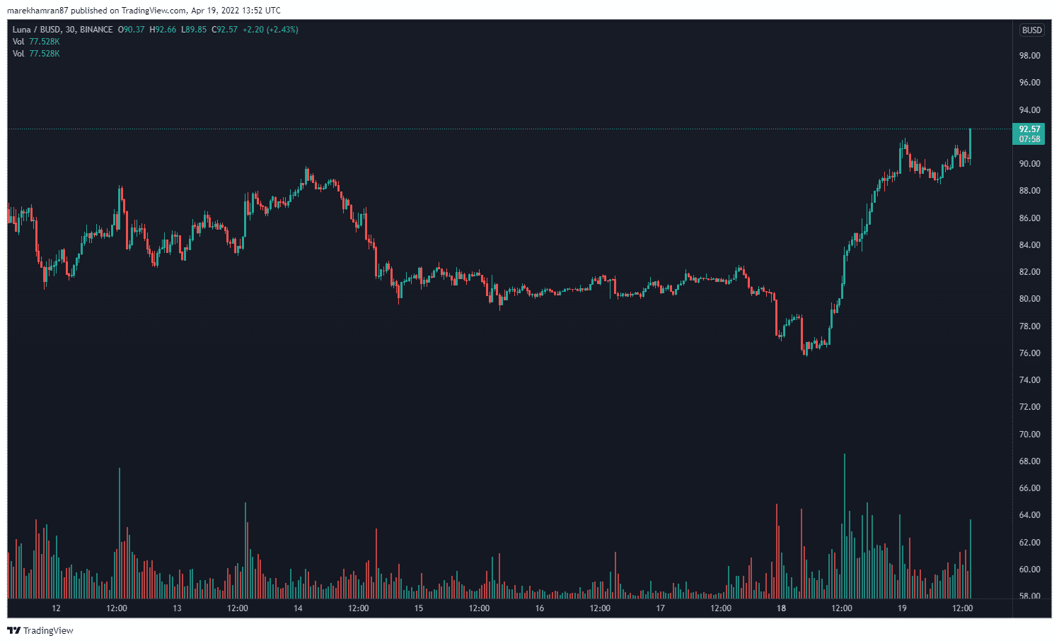 LUNA sa tak zaradila na druhé miesto kryptomien, ktoré zaznamenali v tom istom časovom horizonte najvýraznejší rast. Najúspešnejším projektom je v tomto prípade token GMT, ktorý získal až 41 % profit. Portál CoinMarketCap, presnejšie jeho komunita, predpovedala tokenu LUNA priemernú cenu 93,76 USD, a to koncom apríla 2022. Zdá sa, že táto predikcia nie je ďaleko od reality.