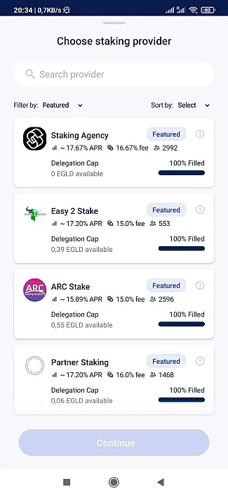 Je tu však jeden malý problém. O staking EGLD je taký obrovský záujem, že tí najväčší staking provideri (SP) sú už plní. Minimálne množstvo na staking je 1 EGLD, je preto vhodné aby ste si vystriehli keď sa uvoľní miesto u nejakého poskytovateľa. Stále je aj miesto u iných, tam je však zhodnotenie okolo 13%.
