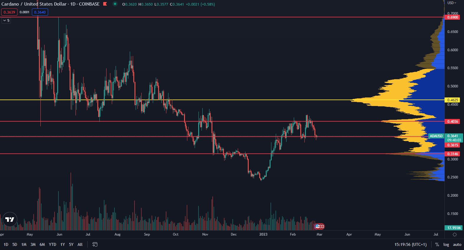 Podľa údajov z TradingView vidíme, že trhová cena ADA sa obchoduje na hodnote 0,36 dolára. Z krátkodobého hľadiska je najvýznamnejší support na hladine bodu kontroly 0,31 dolára. Naopak, bullish cieľ môžeme sledovať na hlavnom bode kontroly na cene 0,46 dolára. Z dlhodobého hľadiska ADA stále nevytvorila rastúce minimum, ktoré bude to najpodstatnejšie a zároveň potvrdí ukončenie korekcie.