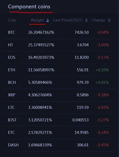 Na obrázku nižšie si môžete pozrieť, ktorými menami je Huobi HB10 tvorený a aké percentuálne zastúpenie majú v ňom jednotlivé kryptomeny.