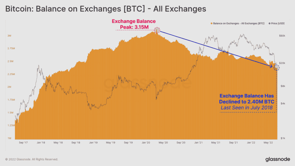 Burzové rezervy naďalej zaznamenávajú veľké výbery, pričom súhrnné zostatky klesajú na úroveň naposledy zaznamenanú v júli 2018. Bitcoin na burzách zaznamenal od marca 2020 odliv až 750 000 mincí. Len za posledné tri mesiace bolo zaznamenaných približne 142 500 BTC v odlivoch, čo predstavuje 18,8 % z celkového počtu. Odlivy v tomto rozsahu, najmä vzhľadom na takýto extrémny pokles cien, sú zaujímavé.