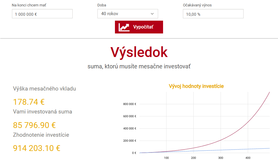 Druhý scenár vychádza z cieľa dosiahnuť jeden milión eur za 40 rokov pri očakávanom ročnom výnose 10 %. Výpočet ukazuje, že investor potrebuje investovať približne 178 eur mesačne. Táto suma pôsobí výrazne dostupnejšie než jednorazový vklad tisícok eur. Pravidelnosť nahrádza vysoký počiatočný kapitál.