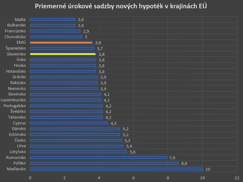 Navyše, priemerná úroková sadzba pre nové hypotéky je na Slovensku stále pomerne nízka v porovnaní so zvyškom Európskej únie (EÚ). Priemer EÚ sa pohybuje na hodnote 3,6 %, zatiaľ čo na Slovensku úroková sadzba dosahuje 3,8 %. Nižšie hodnoty majú už len krajiny ako Španielsko (3,7 %), Chorvátsko (3 %), Francúzsko (2,9 %), Bulharsko (2,6 %) a Malta (2,6 %).