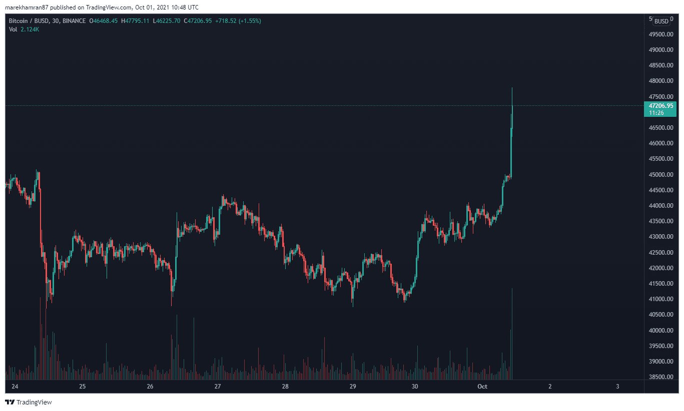 V čase písania tohto článku sa cena BTC prudko zvýšila až na hranicu 47 800 USD.