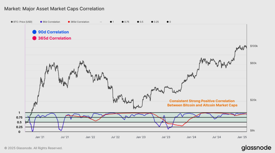 Nasledujúci graf demonštruje, do akej miery sú altcoiny závislé od Bitcoinu. Metrika korelácie vyjadruje, ako zmena ceny Bitcoinu ovplyvňuje zmeny cien ostatných kryptomien. Glassnode navyše porovnalo 90 a 365-dňovú koreláciu.