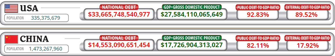 MMF upozornil predovšetkým na dlh USA a Číny. Bez ich zadlžovania by globálny dlh klesal o približne pol percenta ročne. Podľa USDebtClock USA dosahuje v čase písania článku národný dlh 33,6 bilióna dolárov a Čína 14,5 bilióna dolárov. Verejný dlh v pomere k HDP dosahuje USA na úrovni 92,83 % a Čína na 82,11 %. Zatiaľ čo každý Číňan dlhuje menej ako 10 000 dolárov, priemerný Američan dlhuje takmer 100 000 dolárov.