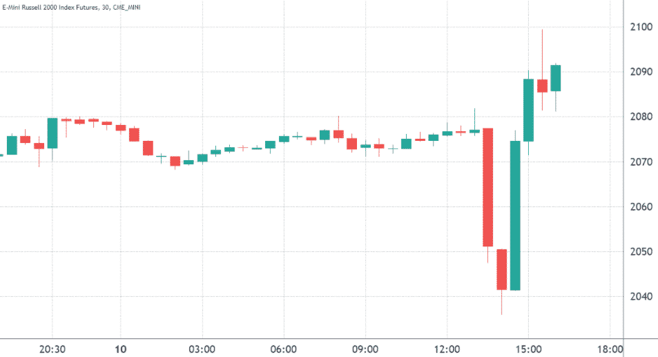 Menové futures na indexe Russell 2000, spoločností kótovaných v USA, klesli o 2 % hneď po zverejnení ekonomických údajov. Akciový index aj Bitcoin sa z tohto poklesu ceny počas nasledujúcej hodiny úplne zotavili.