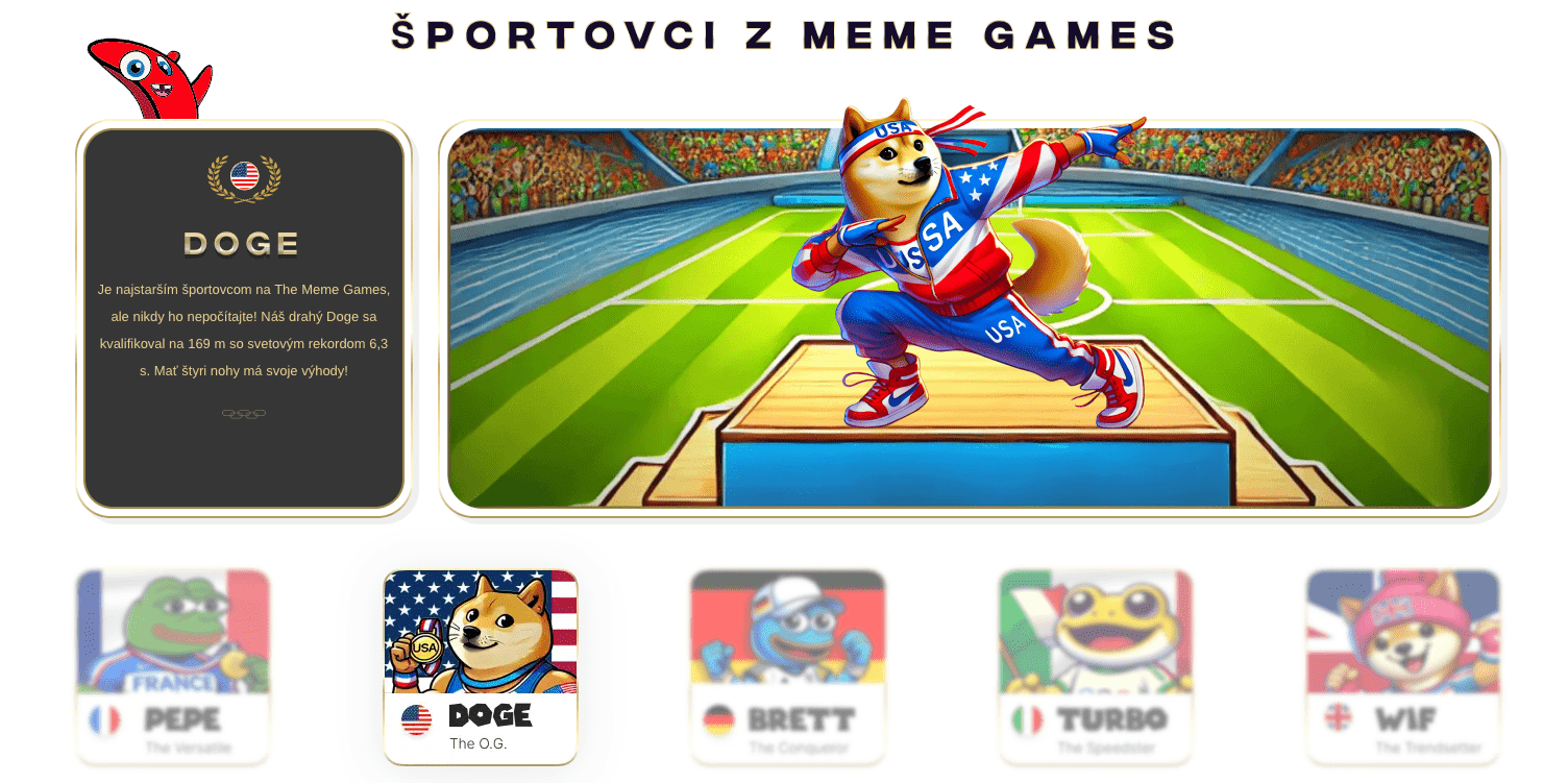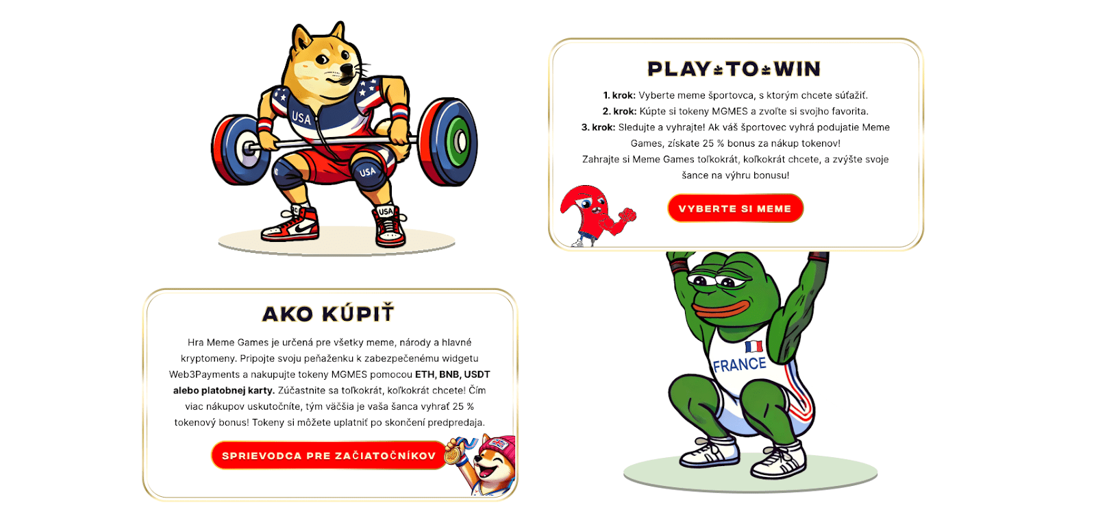 The Meme Games je platforma, ktorá spája vášeň pre vtipné meme coiny s duchom olympijských hier. Držitelia tokenu MGMES budú vyzvaní, aby si vybrali svojho obľúbeného meme avatara – súťažiaceho a to na základe piatich najväčších projektov meme sektora.