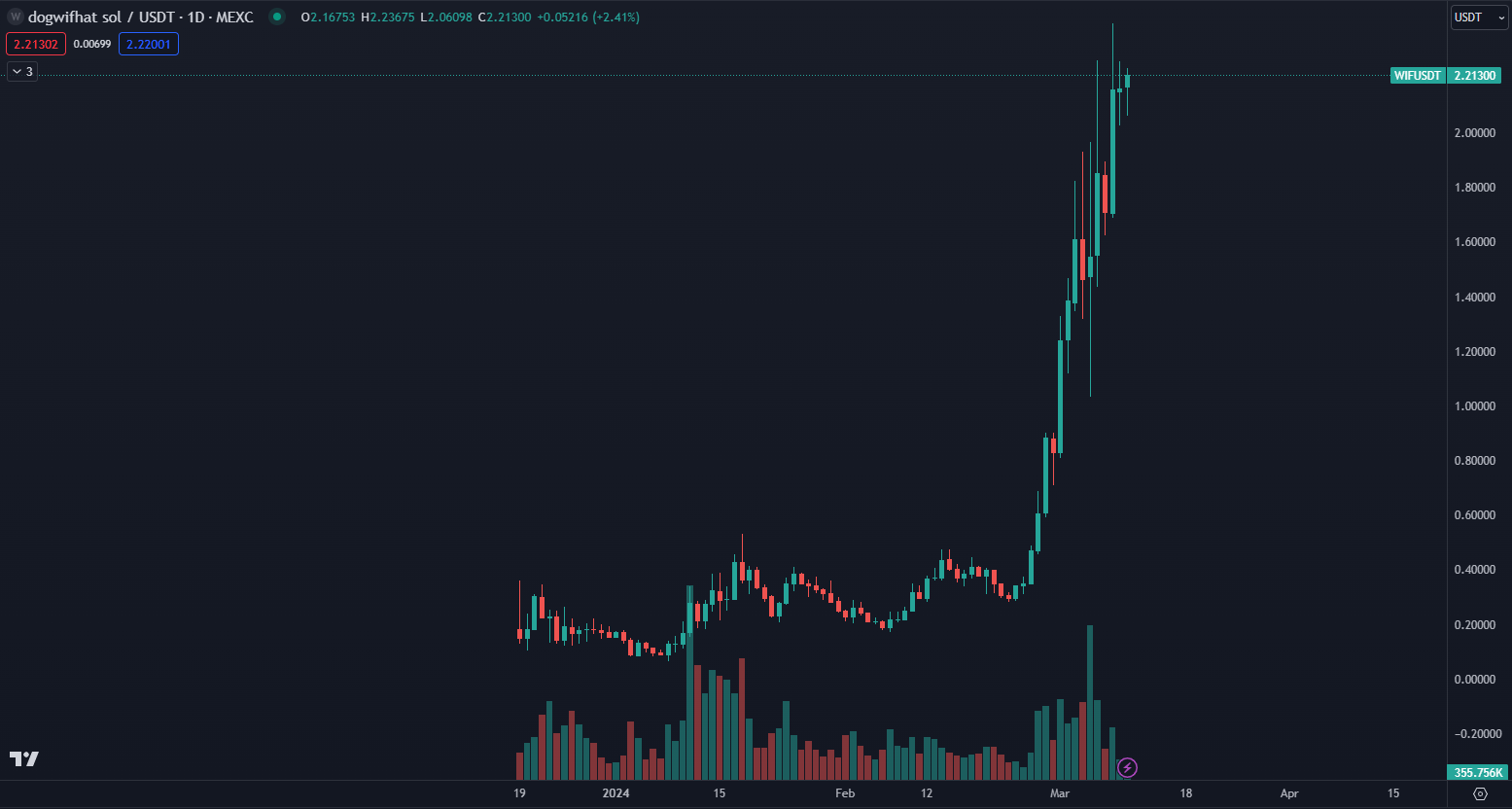 Dogwifhat je podľa údajov CoinMarketCap už 58. najväčšia kryptomena na svete s trhovou kapitalizáciou 2,2 miliardy dolárov. Denný objem obchodovania predstavuje 280 milióna dolárov, čo je približne 12,70 % z celkovej kapitalizácie.