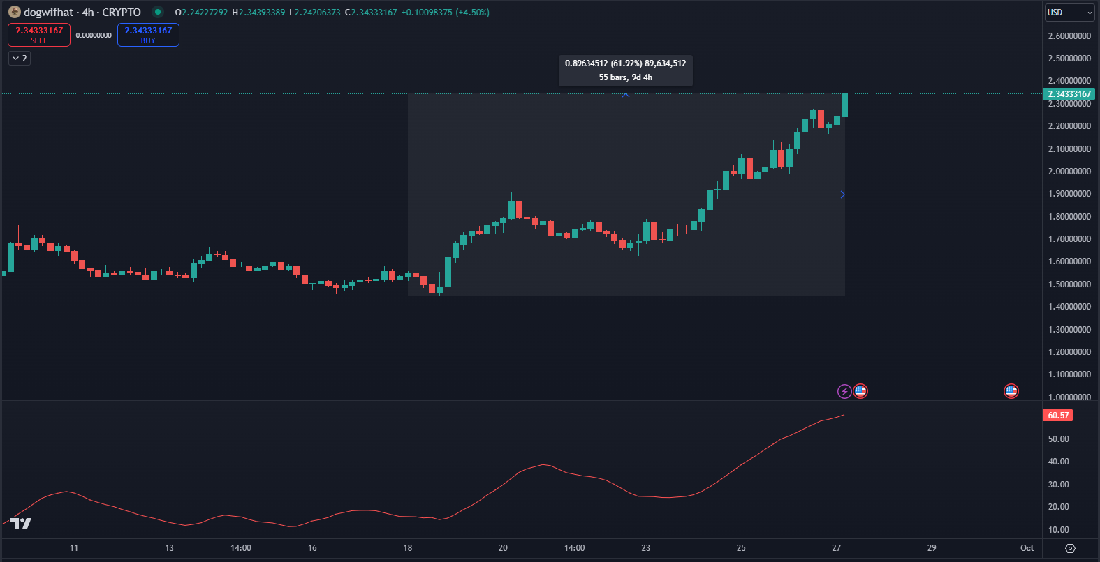 Graf ceny WIF na 4-hodinovom časovom rámci ukazuje vzostupné nastavenie investorov. Vzhľadom na toto pozitívne momentum by meme coin mohol potenciálne cieliť na cenu 2,70 dolárov, ak bude súčasný trend pokračovať. Je však dôležité byť opatrný, pretože prípadný zostupný trend by mohol znížiť cenu WIF späť pod 2 doláre.