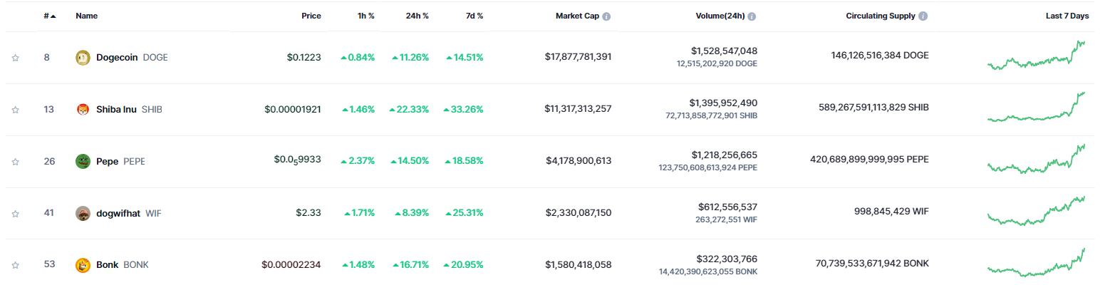 S 24,45 % skokom za posledný týždeň je WIF teraz štvrtým najväčším meme tokenom podľa trhovej kapitalizácie rebríčku CoinMarketCap. Napriek tomu je jeho trhová kapitalizácia stále asi päťkrát menšia ako u SHIB.