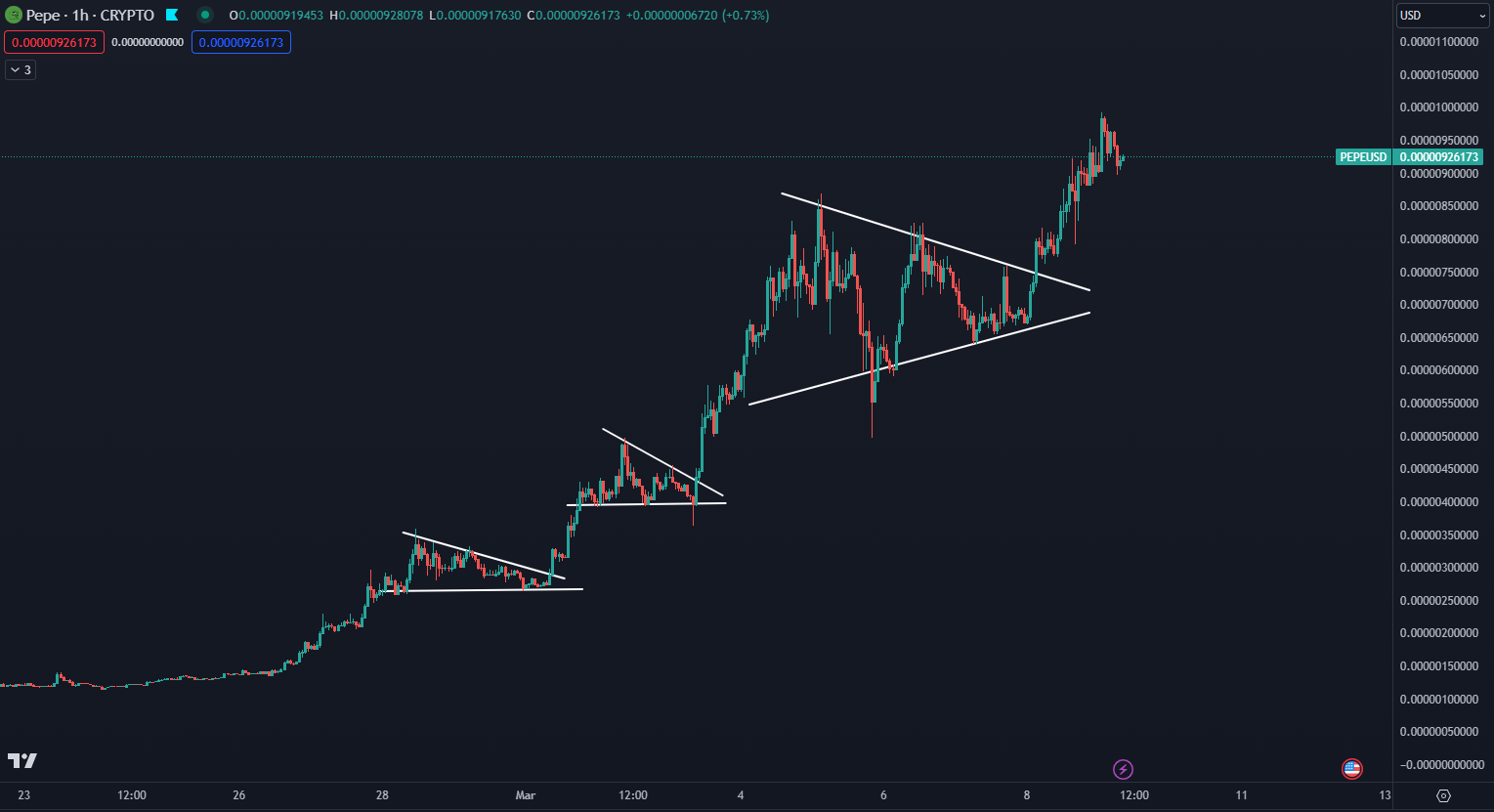 Na grafe nižšie môžete vidieť, že z technického hľadiska je graf PEPE pozitívny, pretože po prudkých rastoch formuje vždy krátkodobú bočnú štruktúru, po ktorej cena zrejme bude pokračovať v raste. Preto existuje pomerne veľký priestor na pokračovanie na nové maximá. Je tu ale jeden háčik.