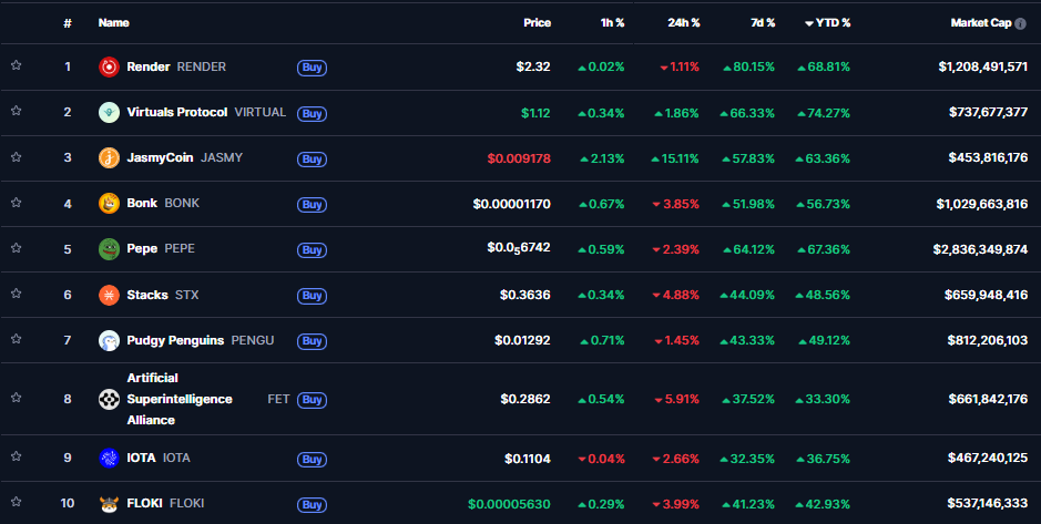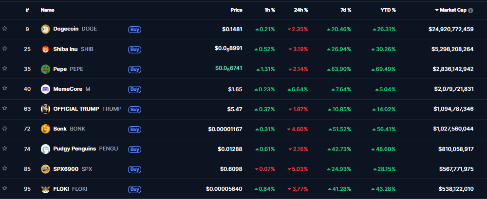 Zatiaľ čo podľa CoinMarketCap Dogecoin a Shiba Inu si za posledný týždeň pripísali 26,33 % a 30,22 %, menšie memecoiny predviedli omnoho dynamickejší rast. Pepe (63,64 %), Bonk (51,54 %), Floki (41,38 %) či Pudgy Penguins (42,70 %) prekonali svojich väčších konkurentov. Aj vďaka tomu vzrástla celková trhová hodnota memecoinov na úroveň 52,4 miliardy dolárov.