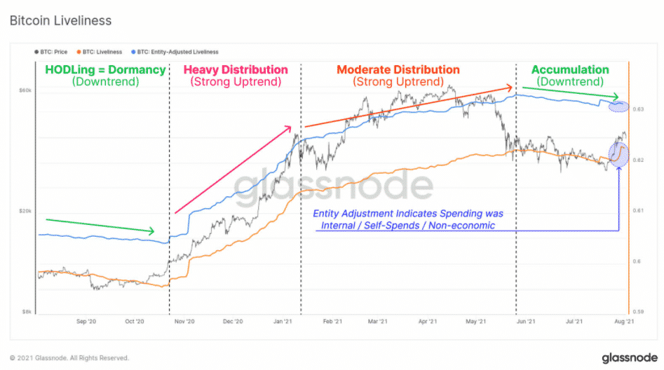 Keď sa pozrieme na makro sentiment, Glassnode sa pri identifikácii trendov akumulácie odvoláva na svoju „metriku živosti”. Tá naznačuje široký trend akumulácie po bezprostrednom májovom výpredaji.