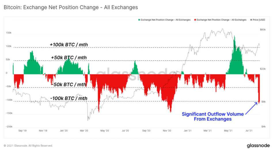 Podľa správy Glassnode The Week On-Chain sa odliv Bitcoinov zrýchlil na rýchlosť presahujúcu 100 000 BTC mesačne, čo je tretíkrát od septembra 2019. Poskytovateľ analytiky odhaduje, že v súčasnosti je v obehu iba 13,2 % cirkulujúcich Bitcoinov držaných na burzách. Ide o nové minimum v roku 2021.
