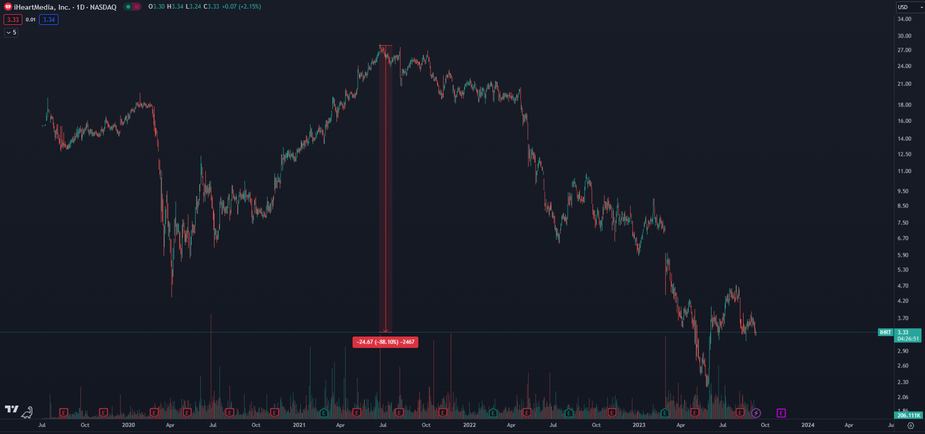 Pod radar Burryho sa najnovšie dostali akcie iHeartMedia, ktoré sa obchodujú na Nasdaqu pod skratkou IHRT. Ide o zdanlivo neznámu spoločnosť a mnohí o tejto investícii pochybujú, keďže akcie tejto firmy klesli v roku 2023 až o 45 %. V skutočnosti však cenová korekcia IHRT pokračuje už dlhodobo.
