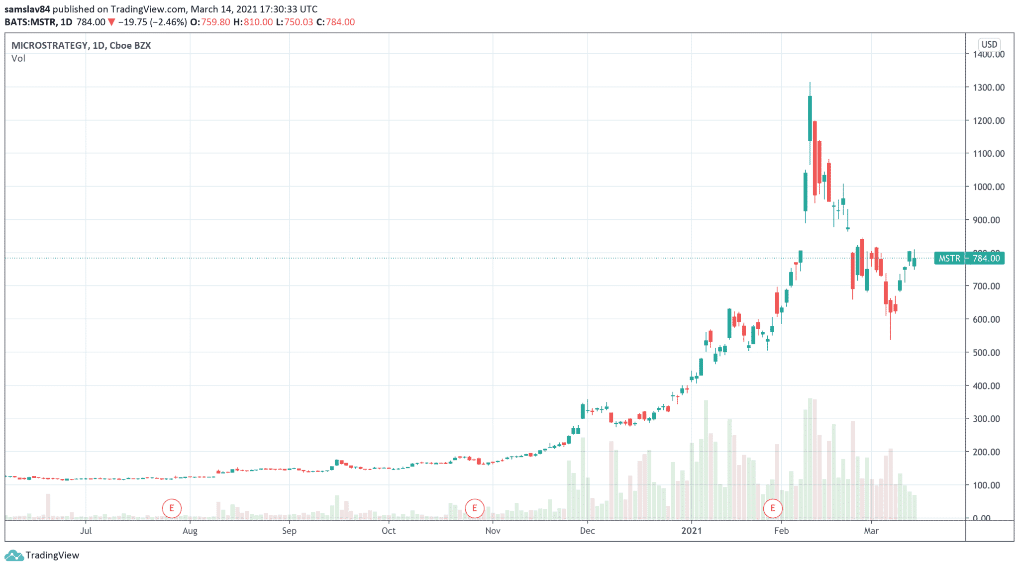Aj akcie spoločnosti vďaka tomu výrazne stúpli. Zo 120 dolárov z leta 2020 na februárové historické maximum 1313 dolárov. Aktuálne sa na burze NASDAQ po väčšej korekcii obchodujú za 784 dolárov. Odrazili sa tak zo dna $540.