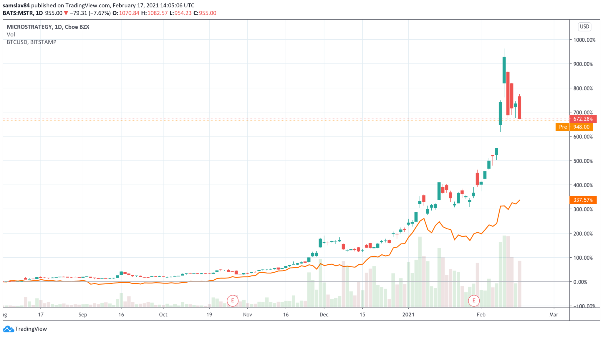 Viď graf (sviečky = Microstrategy, oranžová čiara = Bitcoin)