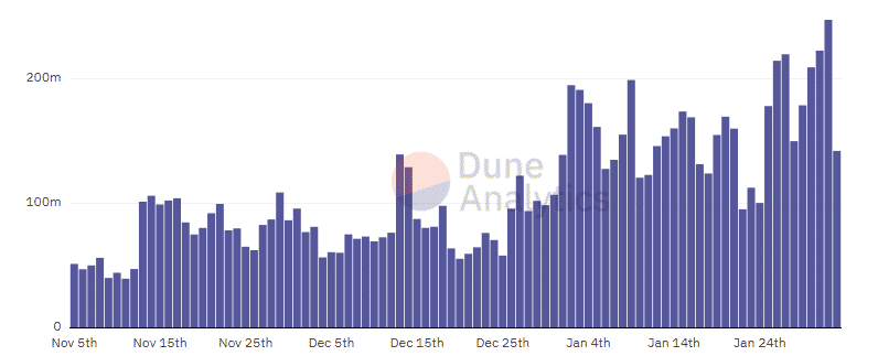 Denný objem obchodov najväčšieho NFT trhoviska OpenSea dosiahol 1. februára hodnotu 247 miliónov USD.