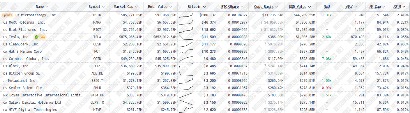 Najväčší držitelia Bitcoinu. Zdroj: bitcointreasuries.net