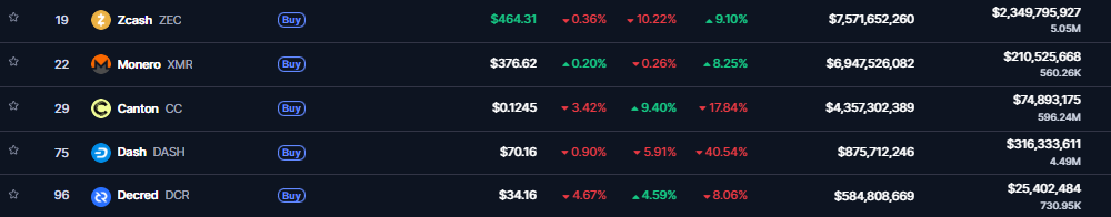 Podľa údajov CoinMarketCap dominuje segmentu súkromných kryptomien Zcash, ktorý dosahuje trhovú kapitalizáciu približne 7,5 miliardy dolárov. Hneď za ním nasleduje Monero s hodnotou okolo 6,9 miliardy dolárov, čo potvrdzuje jeho silné postavenie medzi anonymnými aktívami. Medzi známe projekty patrí aj Dash s kapitalizáciou 875 miliónov dolárov a Decred, ktorý sa pohybuje na úrovni 584 miliónov dolárov. Tieto čísla jasne ukazujú, že trh s anonymnými kryptomenami opäť naberá na sile.