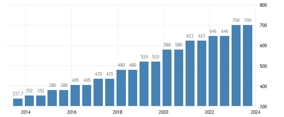 Minimálna mzda na Slovensku podľa údajov Tradingeconomics predstavuje v súčasnosti 700 eur a medziročne naposledy narástla až o 54 eur z hodnoty 646 eur. V prípade, že by minimálna mzda narástla podľa automatu, v absolútnom vyjadrení by išlo o nižšie navýšenie oproti predošlému roku.