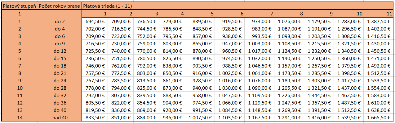 Prvá platová trieda začínala do konca augusta na úrovni 640,50 eur, zatiaľ čo deviata trieda mala plat 1 478 eur. Od začiatku septembra platí, že sumy sa zvýšia na hodnoty 705 a 1 626 eur. Platy učiteľov sa zvýšia v závislosti od triedy z hodnôt 837,50 až 1 514,50 eur na 938 až 1 696,50 eur. Zvýšenie platov schválila ešte koncom augusta 2022 vláda Eduarda Hegera.